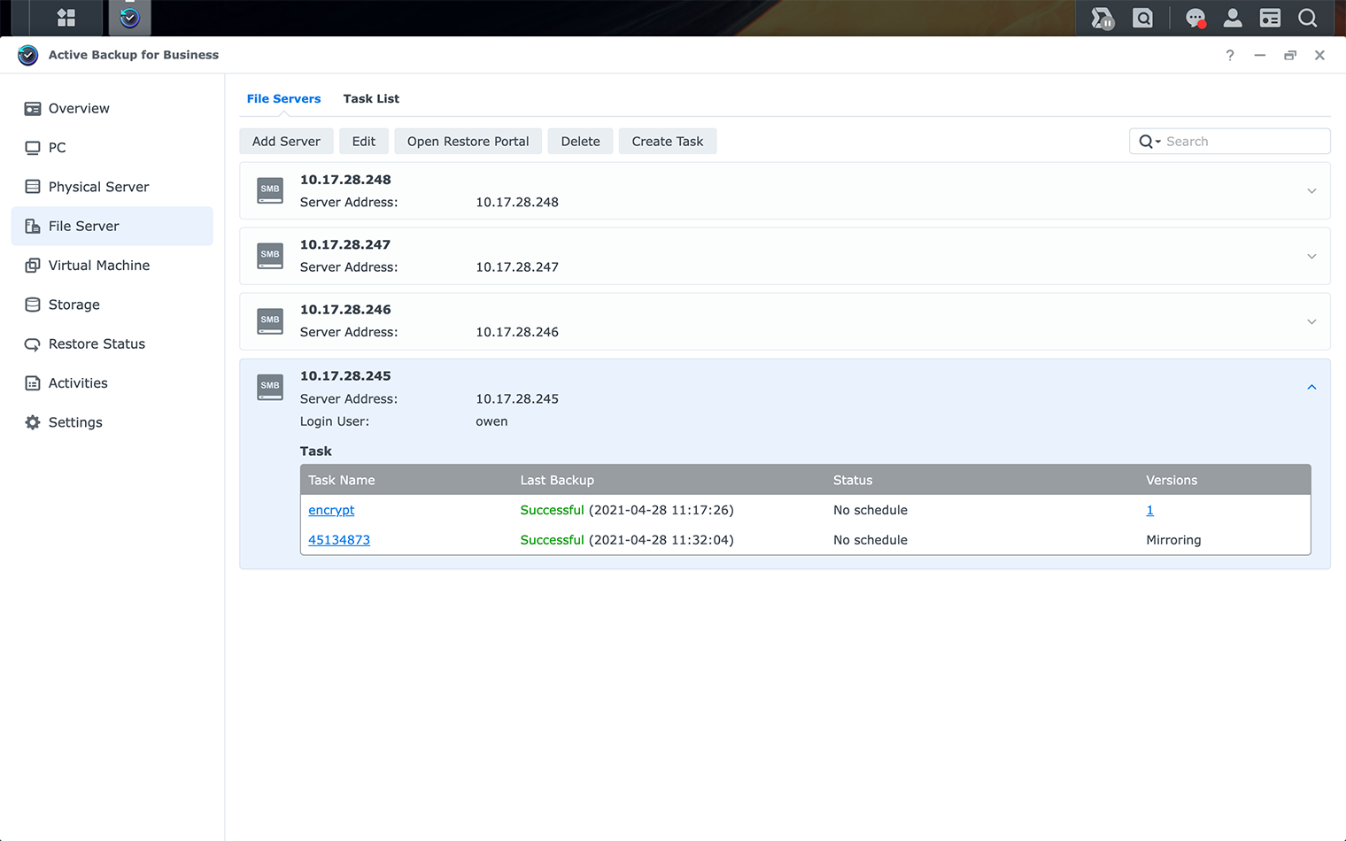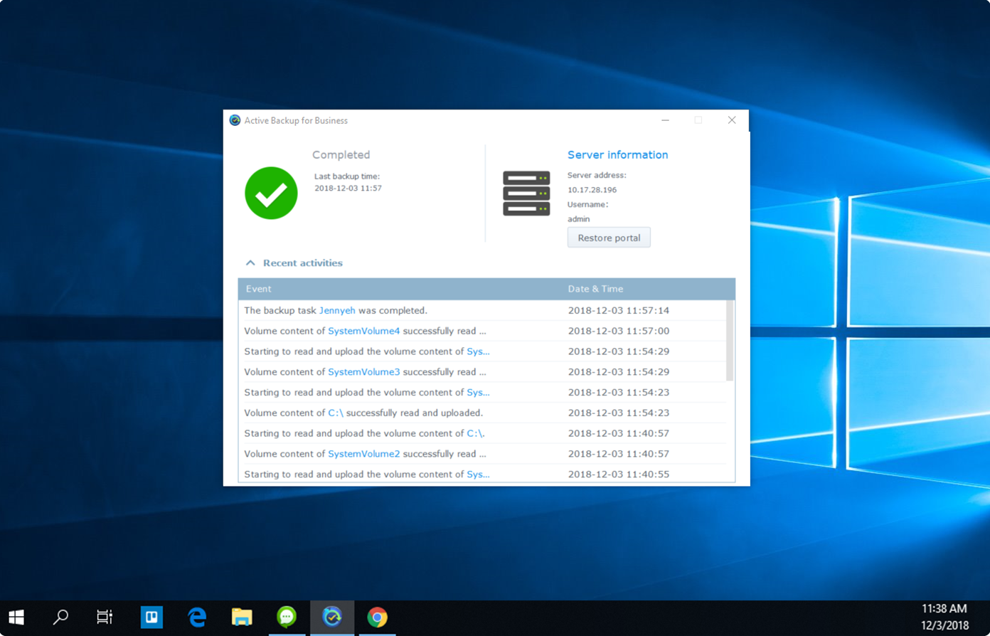 SMB 与 rsync 常见文件服务器协议皆在使用范围内。简单设定 Active Backup for Business 并通过单一面板与 DSM 有效降低 IT 人员的管理费用。