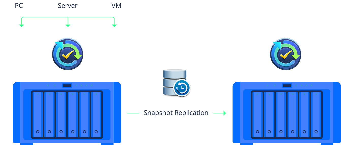 除了 Active Backup 外,Synology NAS 还内置其他多种数据备份功能,同样无需授权费或订阅费,您可以按需使用 Snapshot Replication 秒级快照和复制功能,将 Active Backup 备份数据复制到异地的 Synology NAS,当生产站点出现故障时,可立即还原您的备份数据