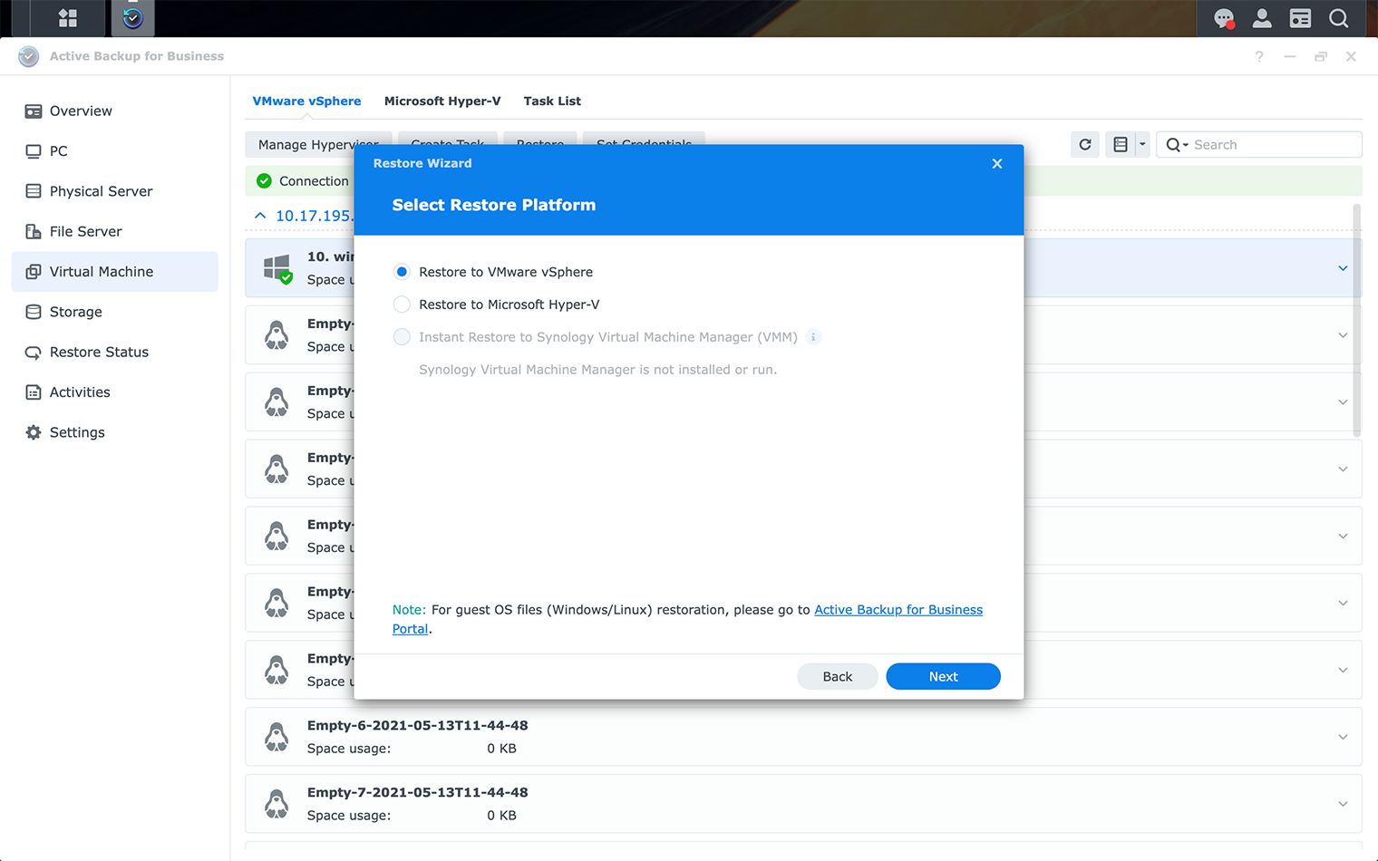 •P2V 还原:可让您快速在 VMware、Hyper-V 或 Synology 自己的 Hypervisor 平台 Synology Virtual Machine Manager 上启动备份映像