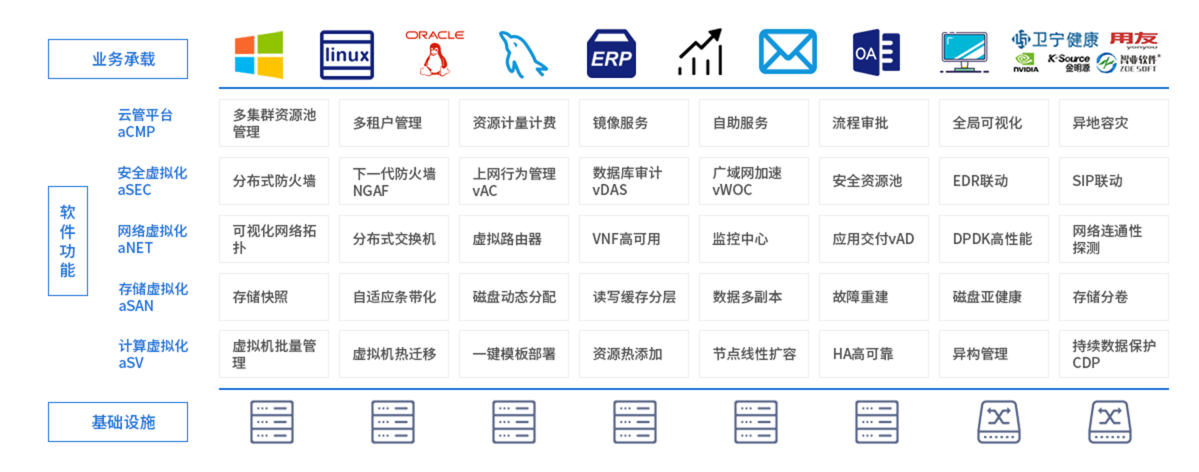 过去数据中心需要购买大量的服务器、存储、交换路由等设备,架构复杂,部署麻烦,硬件成本非常高 ,客户使用企业级云软件后, 只需要购买标准x86服务器+交换机,可以实现传统数据中心的所有功能。